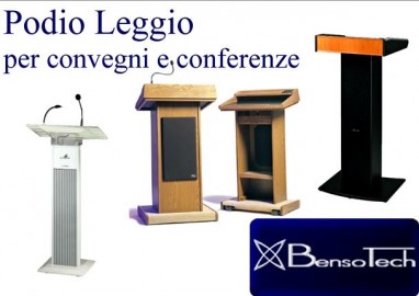 Podio leggio, aste microfoniche, impianti audio per installazione fissa o per l’evento, impianti video, monitor e schermi di grandi dimensioni, luce specifica per riprese video.